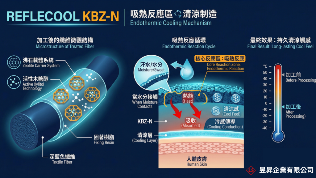 傳統的冷感布料大多僅依賴纖維物理特性,但 REFLECOOL KBZ-N 走得更遠。它運用了先進的生物化學反應,將「冷感」提升到了新的層次。