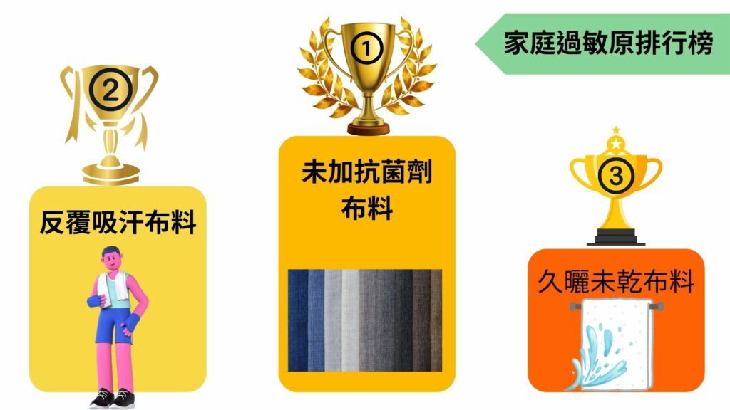 - 未抗菌布料在潮濕環境下,細菌量在24小時內可增長500%。反復吸汗、久曬未幹的布料成爲家庭過敏原TOP3,嚴重影響健康。