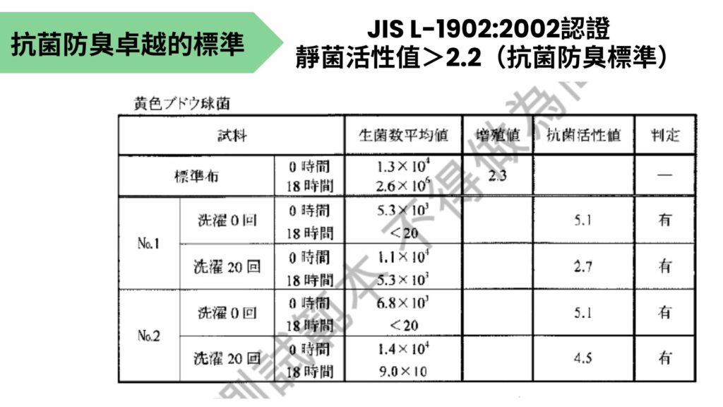 - 實驗結果顯示:在聚酯薄布、壓克力細布和尼龍汗布上,即使經過20次洗滌,其靜菌活性值仍遠高於2.2的抗菌防臭標準,證明了其持久且穩定的抗菌性能。