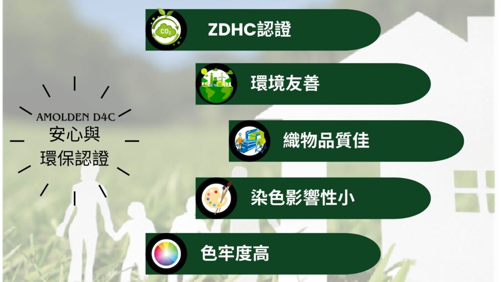 我們引進日本大和化學「AMOLDEN D4C」染色同浴抗菌劑,其【多用途抗菌加工技術】可廣泛應用於聚酯纖維製品,包括家飾織品、抱枕、窗簾用品等,輕鬆打造全方位的生活抗菌防線。本產品通過嚴格耐水洗測試,經Washer法洗滌50次後仍保持優異抗菌效果,使用壽命長,讓家中每一處都能持續安心。