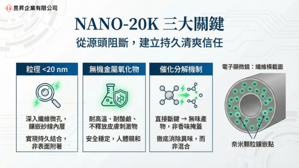 NANO-20K奈米紡織消臭抗菌加工劑以奈米級無機金屬氧化物為核心,可深入纖維內層,從源頭分解汗液產生的臭味分子(如氨、醋酸),而非單純覆蓋或掩蓋氣味。這種「源頭消臭」的方式,使衣物長時間保持清爽感,即使貼身穿著也不尷尬。
